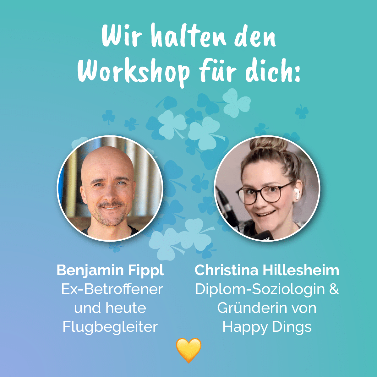 Im Workshop spricht Ben offen über seinen Weg von starker Flugangst bis hin zum heutigen Beruf als Flugbegleiter. Gemeinsam mit Christina vermittelt er dir ein tiefes Verständnis über Auslöser, Mechanismen und hilfreiche Bewältigungsstrategien – ganz praktisch und alltagstauglich.