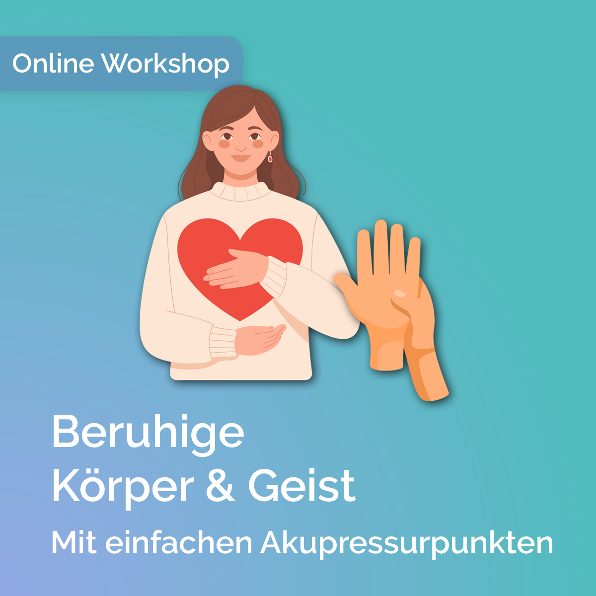 In diesem Online-Workshop lernst du einfache, aber tief wirksame Akupressur-Techniken, um dein Nervensystem zu beruhigen, Ängste zu regulieren und dich wieder sicher in deinem Körper zu fühlen. Physiotherapeutin Gabi und Christina zeigen dir, wie du über bestimmte Punkte am Körper dein emotionales Gleichgewicht wiederfindest – sanft, achtsam und ganz ohne Druck.