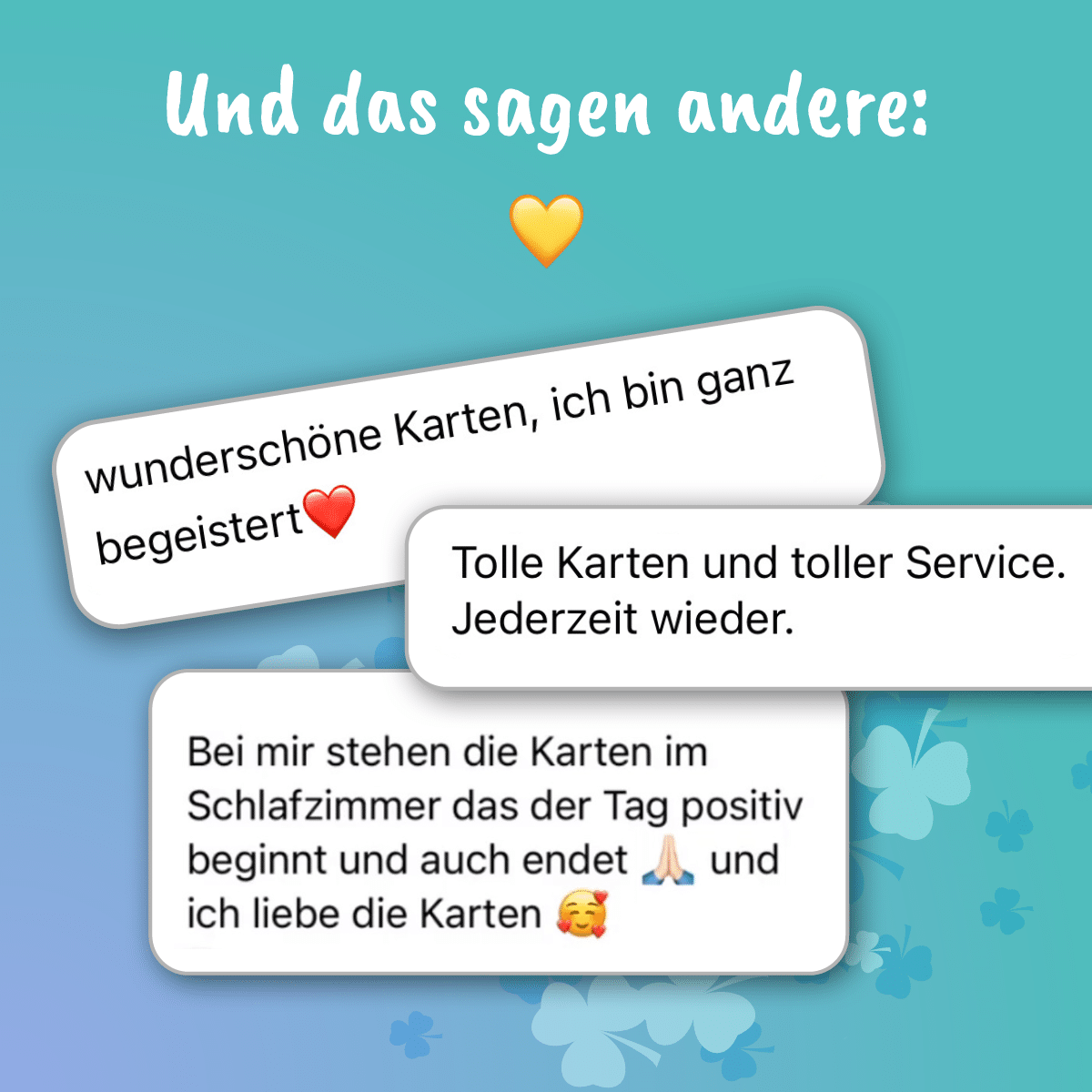 Du kannst die Karten morgens ziehen, zwischendurch aufstellen oder genau dann lesen, wenn der Tag schwer wird. Ein kleiner Satz – mit großer Wirkung.